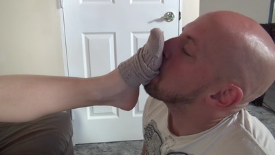 Slave cleans Mistress Nicole's socks and feet with his mouth. (video clip)
