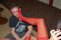 Gia's red stockings are worshiped while she chats on the phone and ignores her slave (gallery)