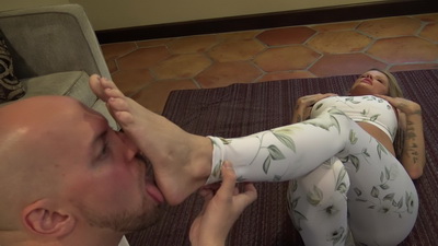 Mistress Sin Sage relaxes while Sheena worships her sexy bare feet. (video clip)